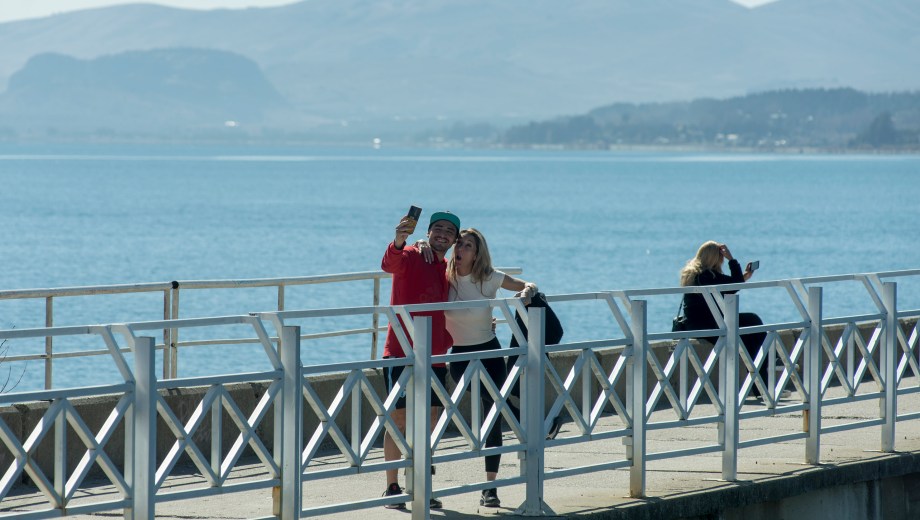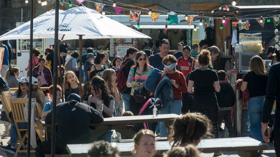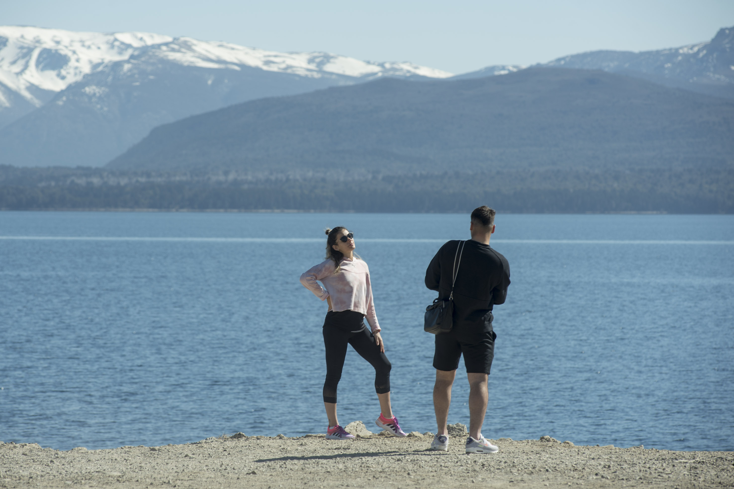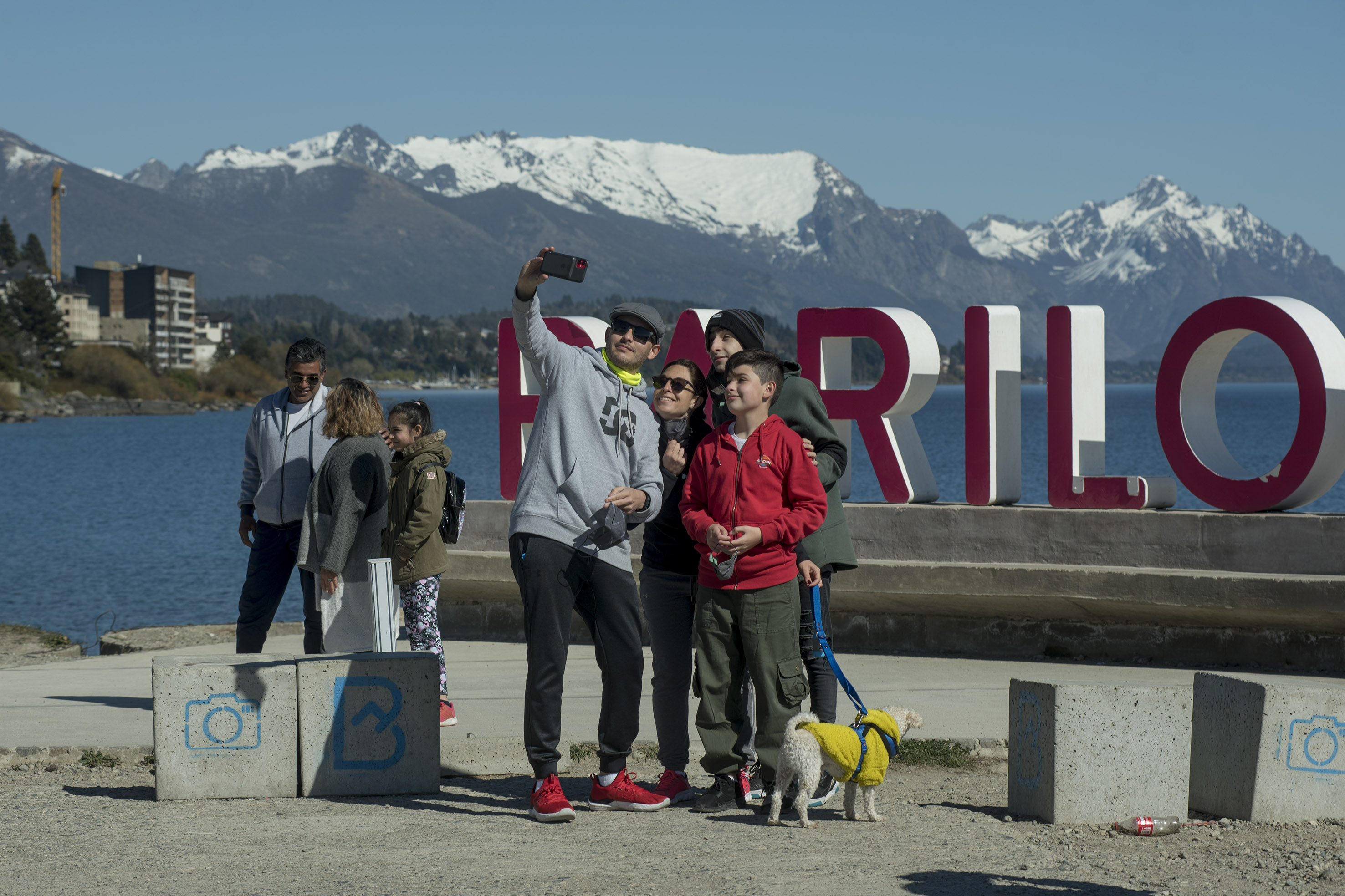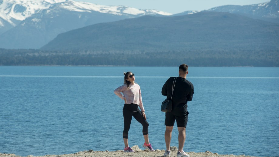A primera hora del sábado, con un sol radiante y el termómetro que marcaba 14 grados, la gente se tomaba fotografías la costa del lago Nahuel Huapi, caminaba por los muelles, consultaba por excursiones y recorría chocolaterías y casa de artículos regionales.
