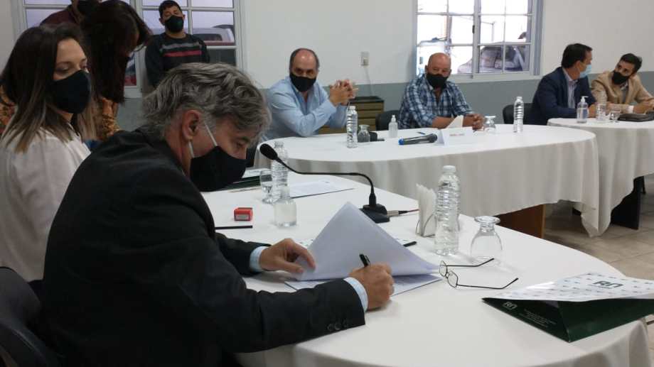 El convenio fue formalizado mediante un acto que encabezó el secretario de Trabajo, Jorge Stopiello; acompañado por la delegada del organismo en Viedma, María Martha Aviléz; y participaron Félix Colin, secretario general del Sindicato de la Carne de Viedma; Emilio Cantero, delegado normalizador del Sindicato de la Carne de Río Negro y Neuquén; y Sergio Seisdedos y Guillermo Richmond, gerentes geeral y administrativo de la empresa.