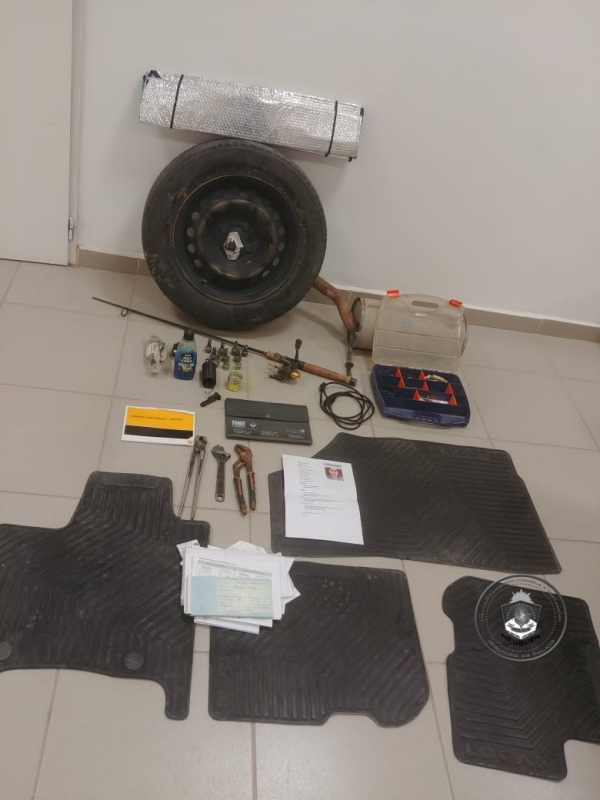 Al ingresar, encontraron «diez tuercas de seguridad para ruedas, una chequera, una caja de pesca, herramientas varias» y repuestos de un vehículo Renault Logan. Agregaron que también se halló «documentación a nombre del damnificado, cuatro alfombras, una caña de pescar, un caño de escape y una cubierta marca Bridgestone».