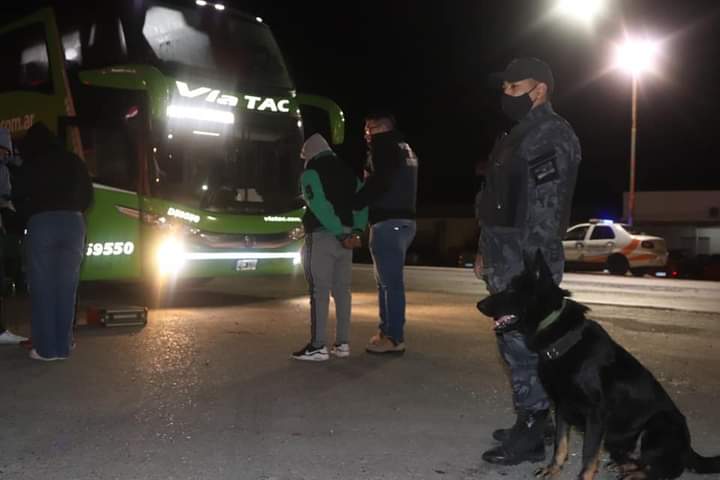 El procedimiento tuvo lugar en la noche del viernes, cuando se procede a detener la marcha de un micro de larga distancia empresa “Via Tac” con destino final a Bariloche, por lo que se realiza el trabajo de rutina en cuanto al control sobre equipaje de bodega y de mano mediante la tarea de canes adiestrados en la búsqueda de estupefacientes.