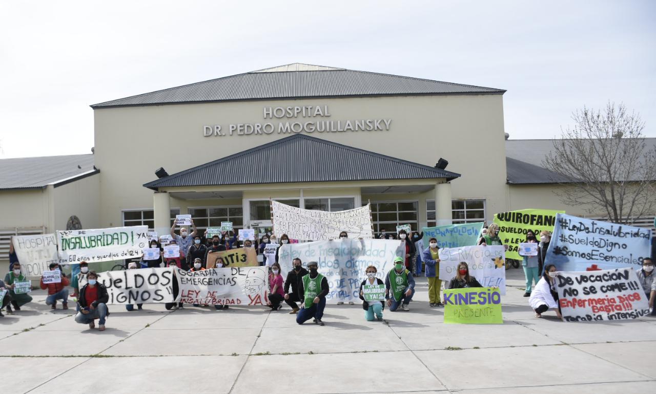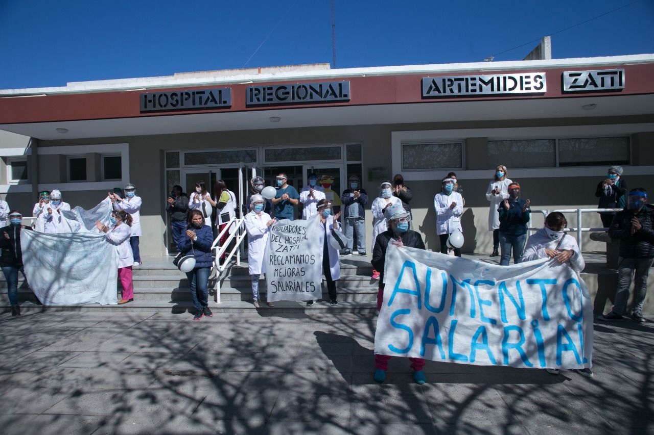 En la capital rionegirna la convocatoria frente al hospital Artémides Zatti, derivó en una manifestación hacia la sede central del Ministerio de Salud de la provincia donde representantes de los trabajadores fueron recibidos por Fabián Zgaib, titular de esa cartera.