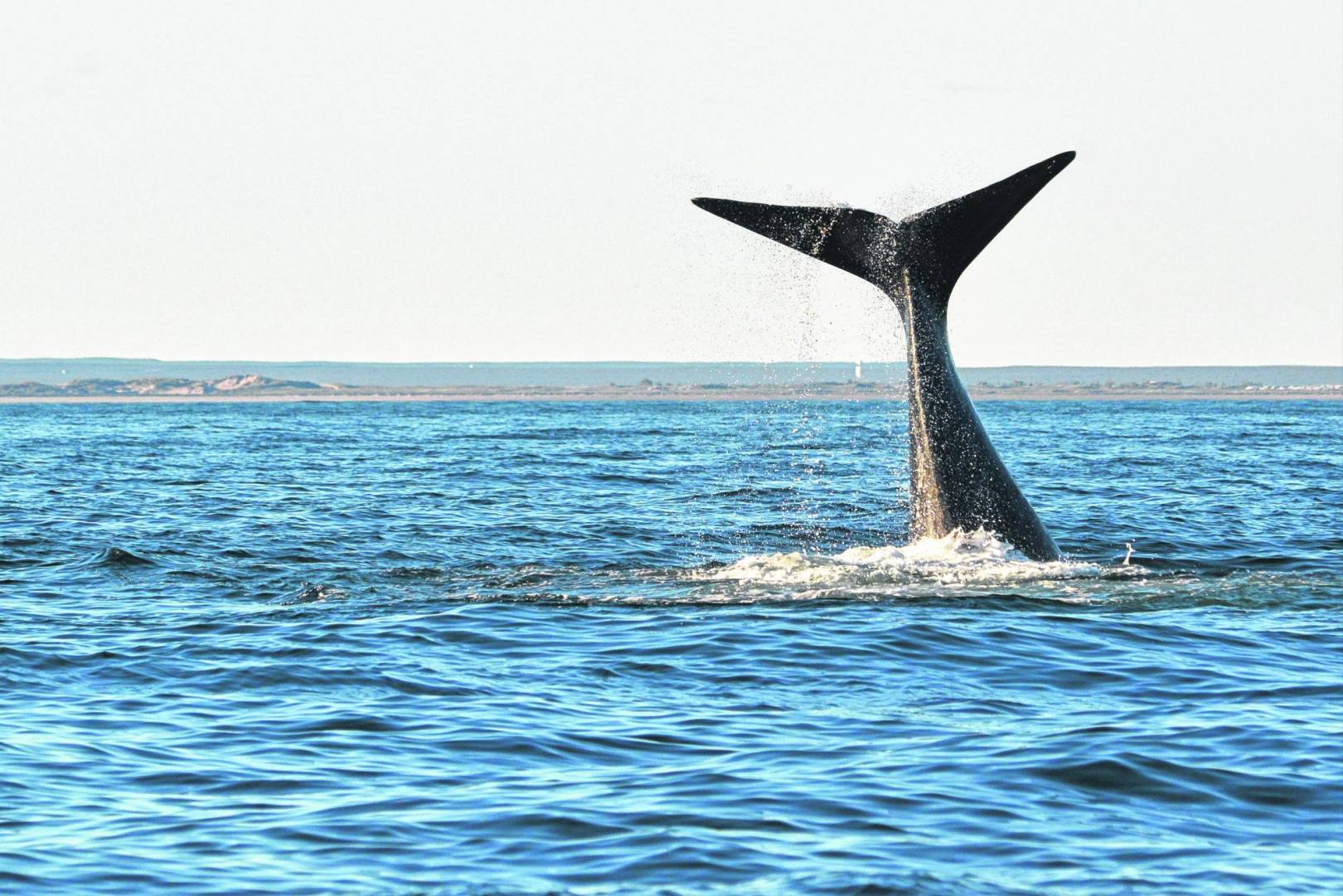 Una ballena franca muestra su cola, que se recorta nítida contra el cielo de fondo. Como siempre, ésa es la imagen más buscada por los pasajeros, que apuran las cámaras para dejar registrado el momento.