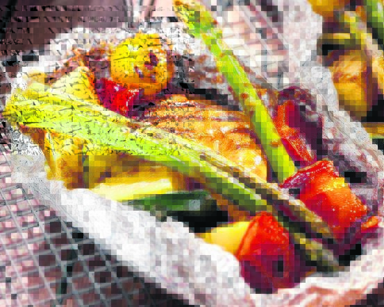 Preparar el fuego y una vez que las llamas se consumieron y se han formado las brasas, colocar los ingredientes en el lugar donde se hizo el fuego y cubrir totalmente con las brasas (se pueden envolver las verduras con papel aluminio). A los 40 minutos aproximadamente retirar, cortar a la mitad, condimentar con sal marina y aceite de oliva.