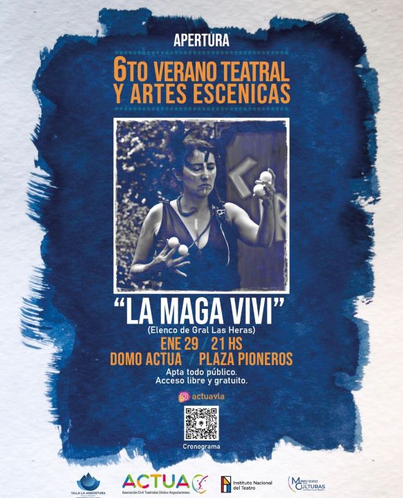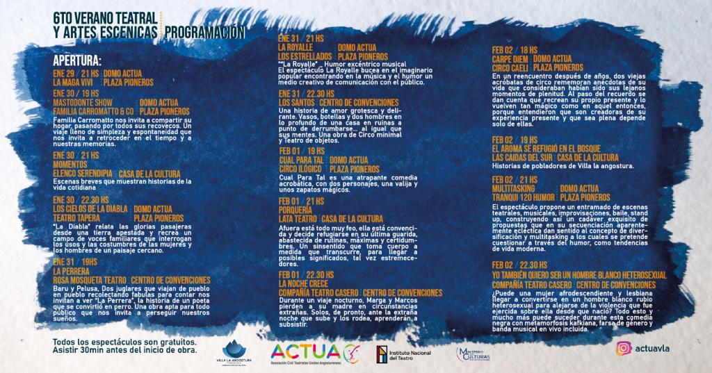 El evento es organizado por la Asociación Civil de Teatristas Unidos Angosturenses (A.C.T.U.A.) con el auspicio del Ministerio de las Culturas, el Instituto Nacional del Teatro y La Municipalidad de Villa La Angostura. Mirá la agenda completa: