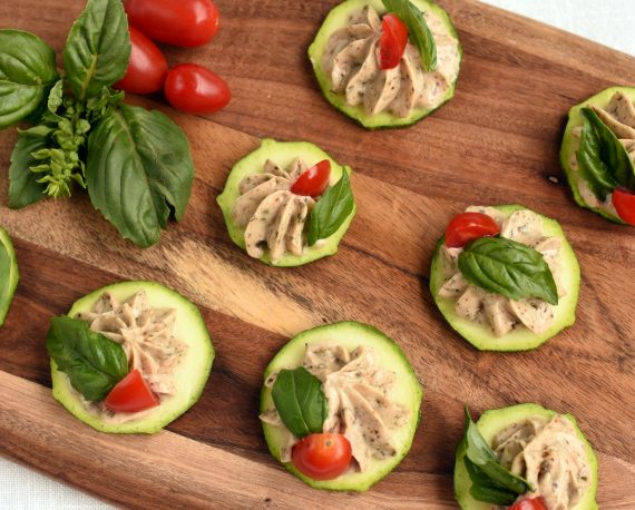 Dip de tomates cherry sobre rodajas de zucchinis
