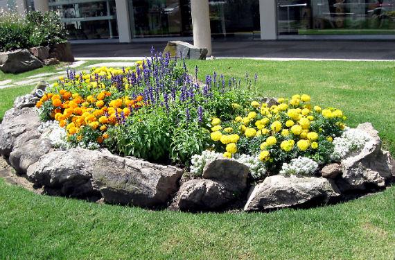 En lugares donde la geografía es otra, con terrenos de grandes pendientes y donde suele ubicarse la casa arriba, el declive pronunciado hace difícil de mantener una carpeta verde. En estos casos, se aconseja remplazar por un jardín de rocas, matizando las plantas de variados colores con arbustos rastreros y coníferas enanas, dando lugar al camino de entrada.