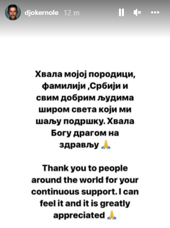 «Puedo sentirlo y es gradiosamente apreciado«, aseguró el serbio en una de las historias publicadas en su cuenta de Instagram.