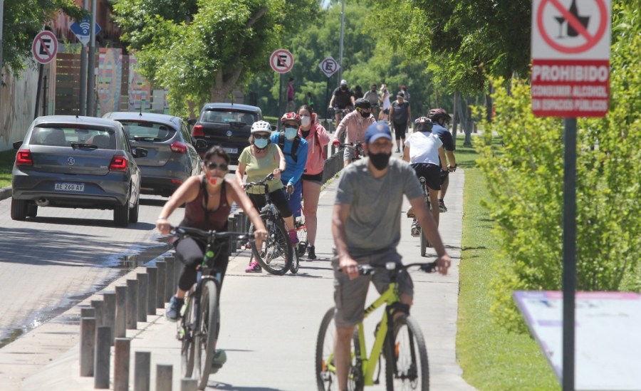 En el Paseo Costero convivieron, tras ocho meses de prohibición, los autos con los ciclistas y peatones que eligieron la orilla del río Limay para la salida recreativa matinal.