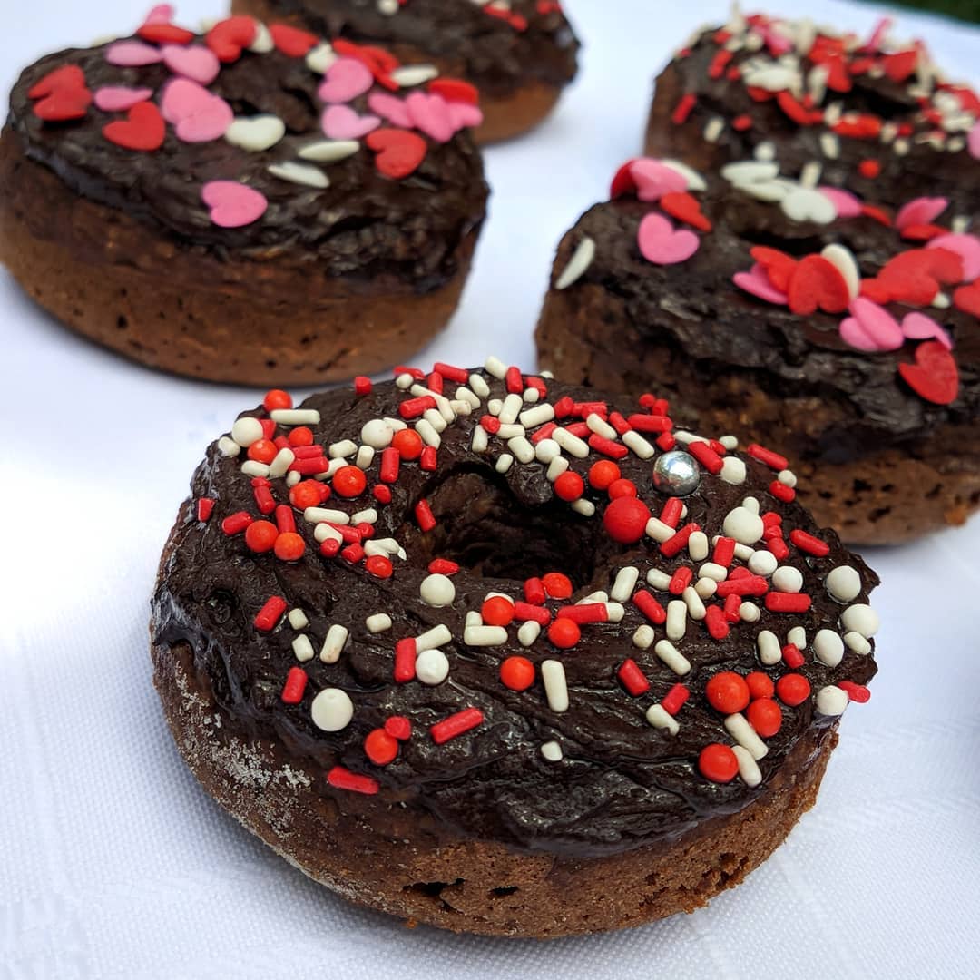 Mezclar los líquidos en un bol incluyendo la miel y edulcorante, luego agregar los secos e integrar muy bien. Engrasar el molde de donas, colocar 3/4 partes de la preparación en cada una y llevar a horno precalentado durante 15 minutos aproximadamente.