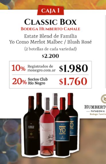 • Desde Bodega Humberto Canale llega la Promo 1, llamada Classic Box. Contiene dos botellas de cada una de estas etiquetas: Estate Blend de Familia (especialmente desarrollada para este día), Yo Como Merlot Malbec (el vino exclusivamente inspirado en esto sello gastronómico de RÍO NEGRO) y Blush Rosé.