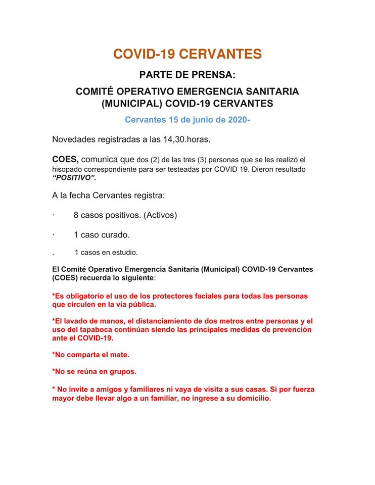 La pequeña localidad de Cervantes vive días de preocupación ante el incremento sostenido de casos de coronavirus. Hoy el Comité de Crisis local informó que dos personas a las que se le habían realizado hisopados por ser casos sospechosos, dieron positivo de coronavirus.