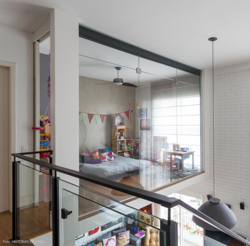 Planta alta Así como sucedió en la baja, la planta alta también pasó por diversas modificaciones. Una de las primeras fue la propia escalera, pintada de negro como para darle un toque industrial. La pareja que habita la casa también decidió agregar placas de vidrio como medida de seguridad cuando nació su hija. Actualmente el piso superior se divide en cuatro sectores: un home office adaptado en el pequeño corredor en el tope de la escalera, el dormitorio principal, que incluye un baño totalmente abierto y el cuarto de la más pequeña de la casa. En el proyecto original ese ambiente estaba destinado a ser un escritorio integrado, por eso no había un cerramiento. ¿Cómo decidieron resolverlo más tarde? Con una pared interna de vidrio, del piso al techo, con una cortina de blackout para preservarla de la luminosidad en la noche. sin secretos El sentimiento de libertad de las amplias aberturas permiten a todos los habitantes de la morada respirar un clima de íntima calidez. “Nada está escondido, nuestra hija puede explorar todo”, explicó la dueña de casa. (Fuente: historiasdecasa.com.br)