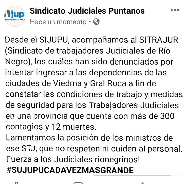 «El SEJuN está en la misma lucha que el SITRAJUR y demas gremios hermanos, la de garantizar la salud y condiciones de seguridad e higiene para los compañeros judiciales y para la sociedad toda que asiste a los tribunales» y enfatizó que «repudiamos esta acción, y las decisiones tomadas desde el STJ de Río Negro, que avasallan derechos humanos esenciales, como la salud».