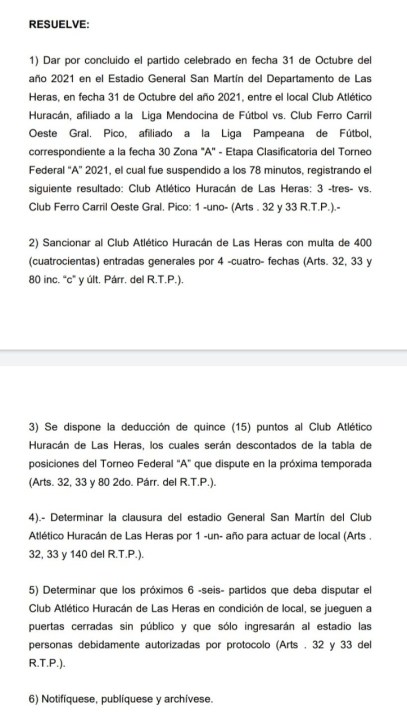 Cuatro días después del tiroteo en cancha de Huracán Las Heras durante un partido de la última fecha del Federal A, que resultó con el técnico de Ferro de La Pampa herido, el Tribunal de Disciplina del Consejo Federal dio a conocer el fallo contra el club mendocino.