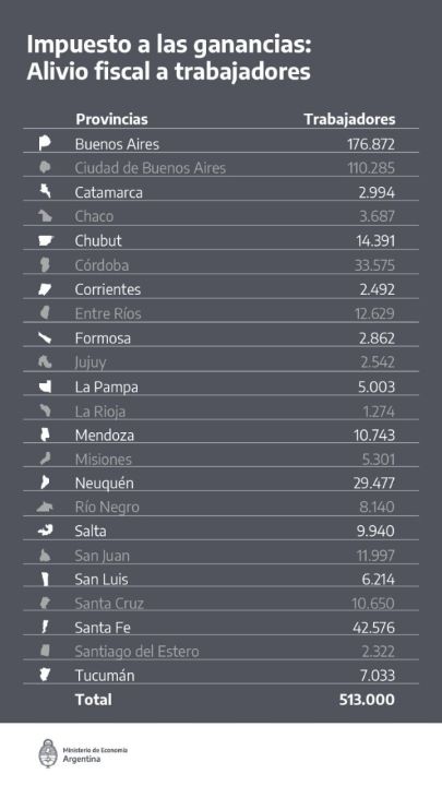 La medida beneficia a 513 mil trabajadores y trabajadoras de todo el país que se encuentran sujetos a retenciones del impuesto a las Ganancias y registran salarios brutos mensuales de entre $ 506.230 y $ 880.000. En este sentido, más del 50% de los trabajadores que hoy pagan el impuesto a las Ganancias están alcanzados por el beneficio sobre el aguinaldo.