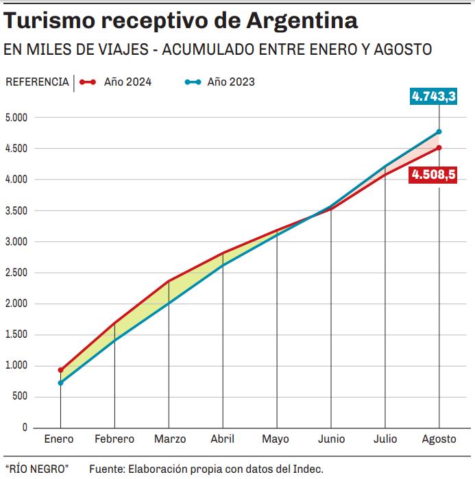 El fortalecimiento del peso deteriora la relación de cambio para los turistas foráneos que buscan visitar nuestro país. En los primeros ocho meses del 2024, se registraron 4,5 millones de viajes turísticos hacia Argentina. Ese valor es un 5% menor que en igual período del año pasado.