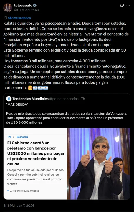 Haciendo una crítica a la oposición, Caputo afirmó que “cancelamos deuda. Equivalente a financiamiento neto negativo, según su jerga”, fue lo que esbozó el Ministro económico en sus redes, y agregó que el kirchnerismo “siempre se dedicó a aumentar el déficit y consecuentemente la deuda (300 mil millones mientras gobernaron)”.
