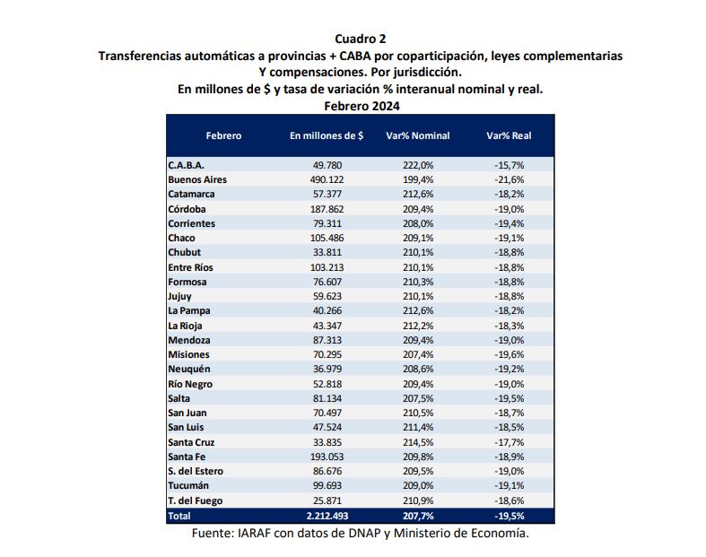 En el acumulado al primer bimestre del año, las transferencias automáticas por coparticipación alcanzaron los $4.5 billones, que equivalen a una caída real del 15,4%. “Esto implicaría el menor monto real para el primer bimestre de los últimos 9 años”, aseguró IARAF.