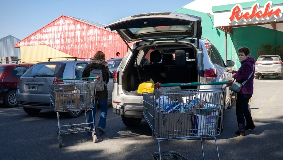 Colas en los supermercados antes del horario de apertura, changos abarrotados de productos, gente intentando acomodar pilas de cajas y bolsas en los baúles de los autos con patentes chilenas. El proceso que comenzó meses atrás en los comercios de Bariloche se intensificó en los últimos días con los feriados de Chile y el alza constante del dólar.