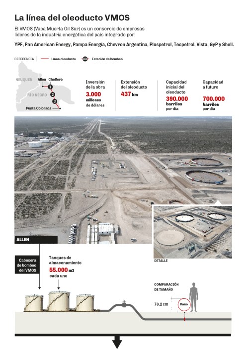 El oleoducto VMOS conecta Vaca Muerta con el Atlántico con una inversión total de U$S 3.000 millones, la obra garantiza ingresos superiores a los U$S 1.000 millones para Río Negro en los próximos 13 años.