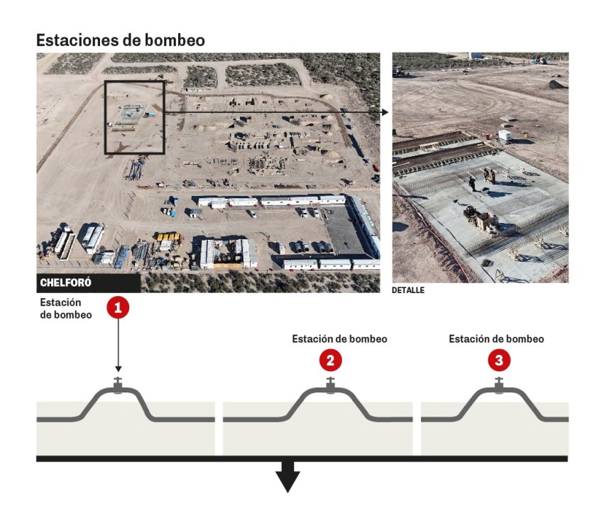 La obra tiene cuatro bloques principales en los que avanza con el objetivo de que a finales del año que viene esté operativa. Actualmente se realiza la soldadura de los ductos entre el sur del río y Sierra Grande; se construye la cabecera de bombeo de Allen; la estación de bombeo intermedia de Chelforó; y se avanza la gigantesca terminal portuaria de Punta Colorada.