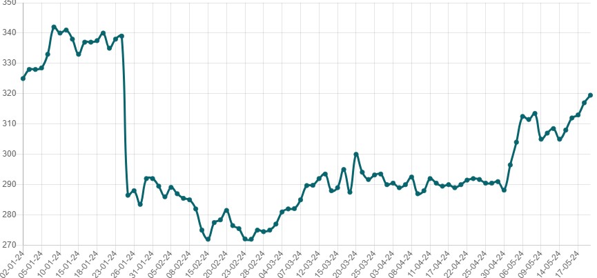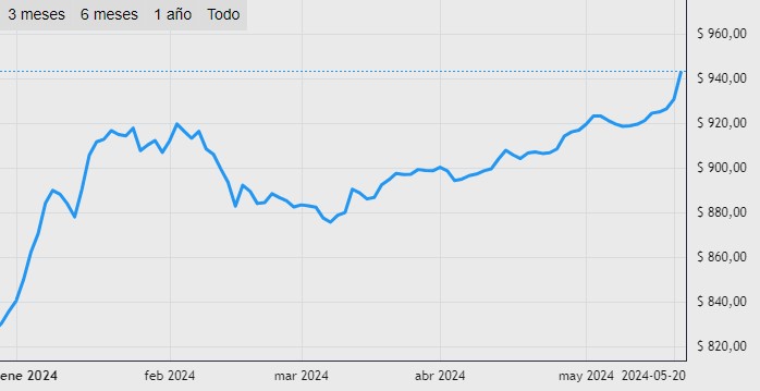 Luego de tocar mínimos desde 2020, la cotización de la soja en el mercado de Chicago se ha recuperado y acumula una suba del 10,9% en el mes de mayo, según se desprende del sitio Agrofy. Este martes, la oleaginosa alcanzó su precio en dólares más alto en cuatro meses, como se aprecia en el gráfico siguiente.