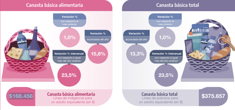«La CBA y la CBT acumulan en el año incrementos del 15,8% y 13,3%, respectivamente, y ambas registraron variaciones interanuales del 23,5%«, señalaron.
