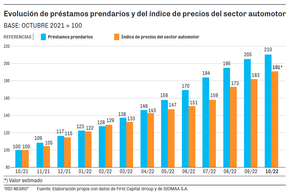 Las tasas de interés reales negativas (por la elevada inflación) y el alto grado de incertidumbre constituyen determinantes del bajo nivel de crédito interno en Argentina. De acuerdo con un informe de First Capital Group, el monto total de préstamos en pesos al sector privado aumentó un 71,8% interanual en octubre, muy por debajo de la inflación. Pero, por su parte, la línea de préstamos prendarios fue la única que tuvo un incremento en términos reales, creciendo un 110,4% respecto de igual mes de 2021.