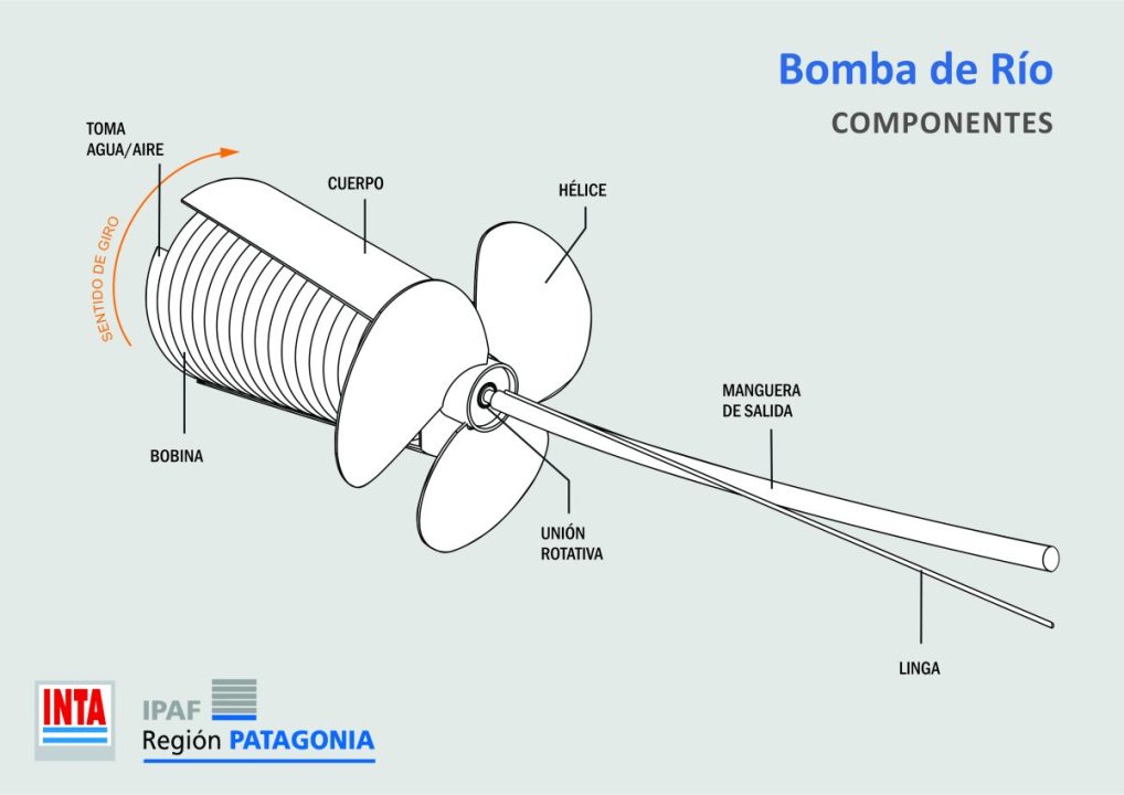 Por su parte, Maira Guiñazú –coordinadora de la Red de Acceso, Uso y Gestión del Agua del INTA– explicó el origen de esta alternativa a los equipos de bombeo por combustión: “rescatamos una ecotecnología sustentable poco utilizada que ha servido para bombear agua en poblaciones tanto de los grandes ríos de África como de pequeños arroyos poco profundos del norte de América”, señaló la investigadora del IPAF Patagonia, y agregó: “Su principio de funcionamiento se basa en el tornillo de Arquímedes, utiliza la energía hidrocinética de los ríos, y puede construirse con materiales reciclados, de bajo costo y localmente disponibles”.