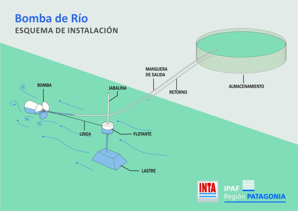 La bomba de río debe anclarse y flotar con la mitad del cuerpo sumergido en el río, arroyo o canal. Si bien puede colocarse con diferentes niveles de inmersión se calcula una buena relación de elevación y caudal con el 50% de la bomba sumergida, asistida por un flotante en su interior y sujeta por una eslinga a una jabalina o estaca.