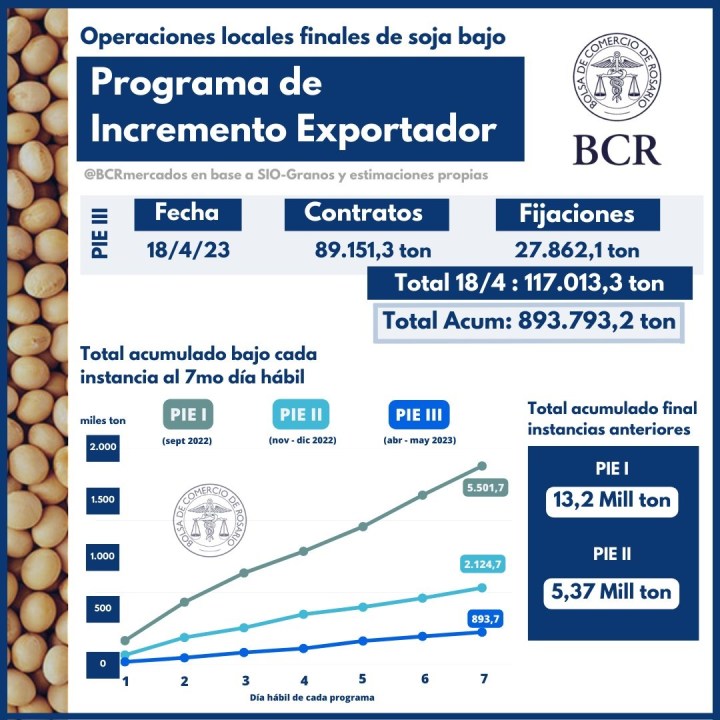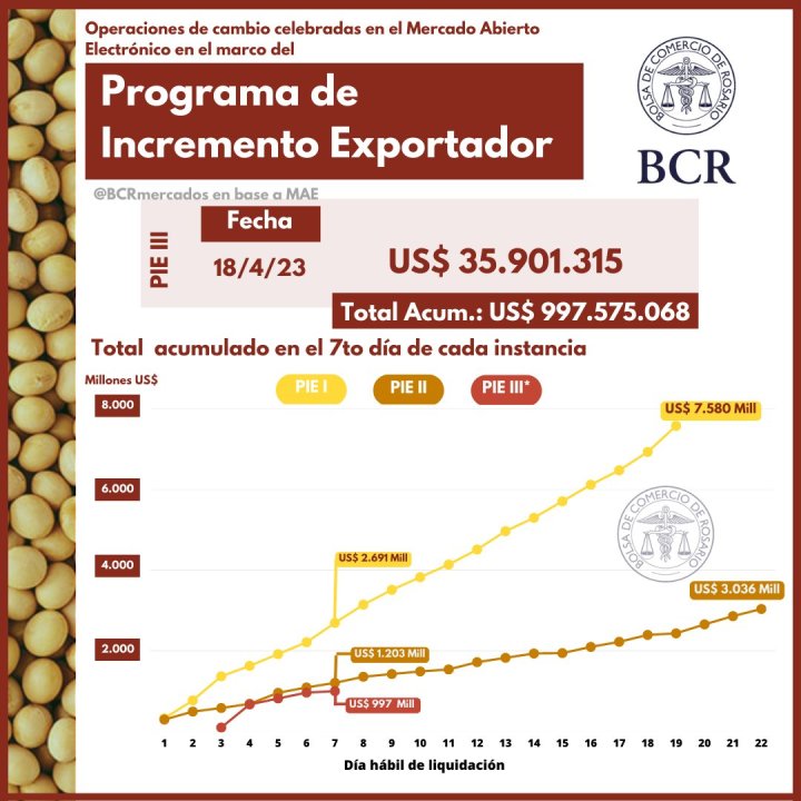 La tercera edición del denominado Programa de Incremento Exportador (PIE), más conocido como "dólar agro", ya está en vigencia. En ese sentido, la Bolsa de Comercio de Rosario (BCR) dio a conocer los resultados de la medida en sus primeros 7 días hábiles con datos y gráficos.