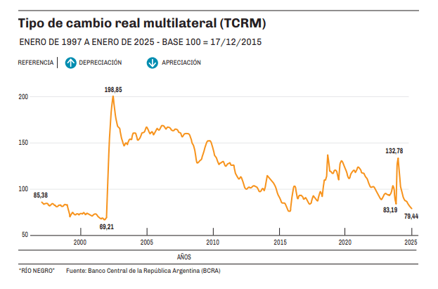 El indicador (con Base 100 en diciembre de 2015), se ubicaba en 83,19 cuando Javier Milei asumió la presidencia, y se elevó hasta 132,18 tras la devaluación del 118% establecida por Luis Caputo en diciembre de 2023. Trece meses después, en enero de 2025, el ITCRM se ubica en 79,44.