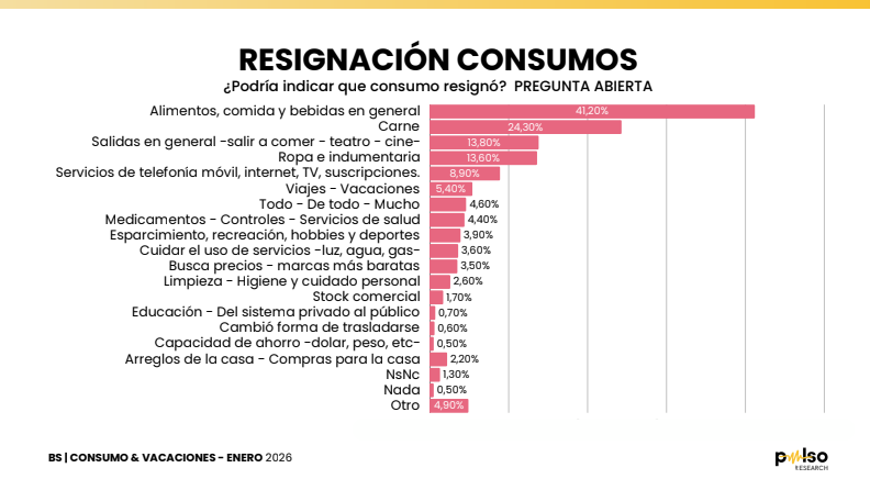 En efecto, mediante una consulta múltiple y abierta, Pulso Research indagó acerca de cuáles son los bienes y servicios que las familias han resignado. Un 41,2% de los consultados asegura que ha dejado de consumir «Alimentos, comida y bebidas en general», mientras que un 24,3% especificó que ha resignado el consumo de carne. En tanto un 13,6% dice haber resignado la compra de «Ropa e indumentaria».