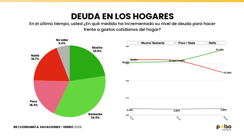 Por ultimo, Pulso Research indagó respecto al nivel de endeudamiento de las familias. El estudio arroja que un 57,1% de las familias se ha endeudado en el último tiempo para poder sostener las cuentas del hogar. De ese total, un 34,5% afirma haberse endeudado «bastante», mientras que un 22,6% dice haberse endeudado «mucho».