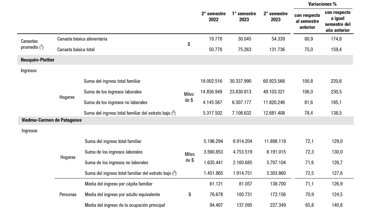 Según los datos aportados para el segundo semestre de 2023, el 25,1% de los hogares son pobres en Neuquén, alcanzando el 30,8% de las personas. En el primer semestre, los números alcanzados en la misma variable fueron de 27,1% para hogares y el 34,3% de personas.