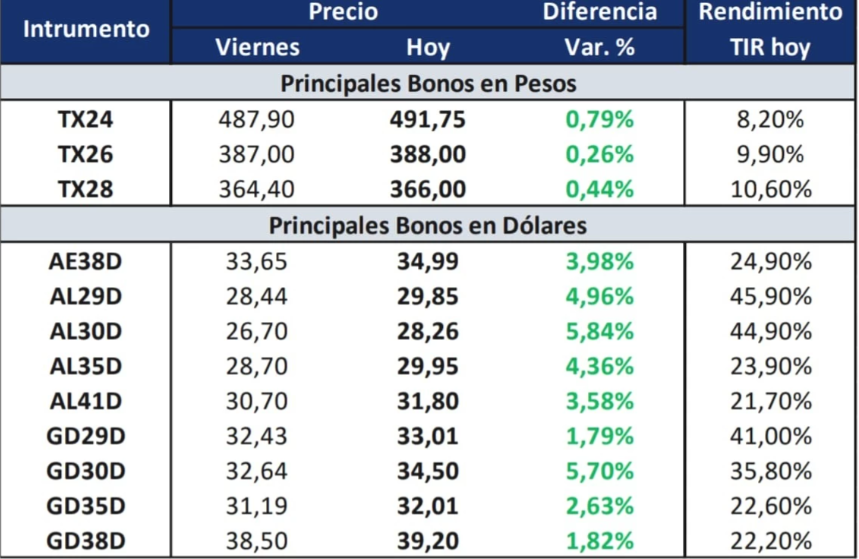 Los bonos exhibieron un fuerte impulso. El TX26, bono con ajuste CER con mayor volumen en pesos, cerró en $388 (+0,26% respecto al viernes pasado). Por su parte, el TX24 lo hizo en $ 491,75 y el TX28 en $ 366.