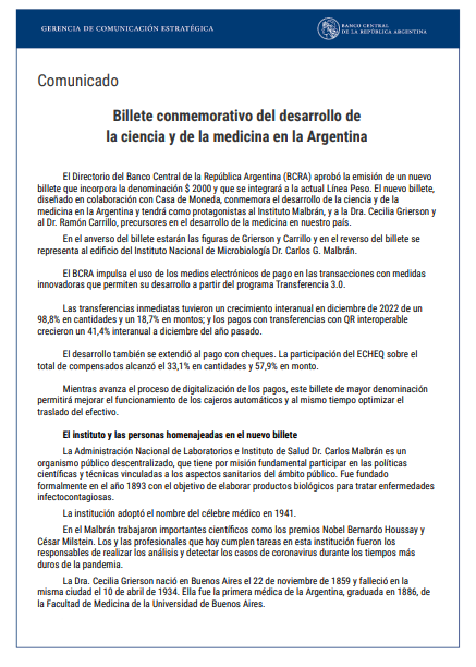El Banco Central de la República Argentina confirmó éste jueves que su directorio aprobó la emisión de un nuevo billette de $2000 y que entrará en circulación en los próximos meses. "El nuevo billete fue diseñado en colaboración con Casa de la Moneda y conmemora el desarrollo de la ciencia y de la medicina en la Argentina", se anunció oficialmente.