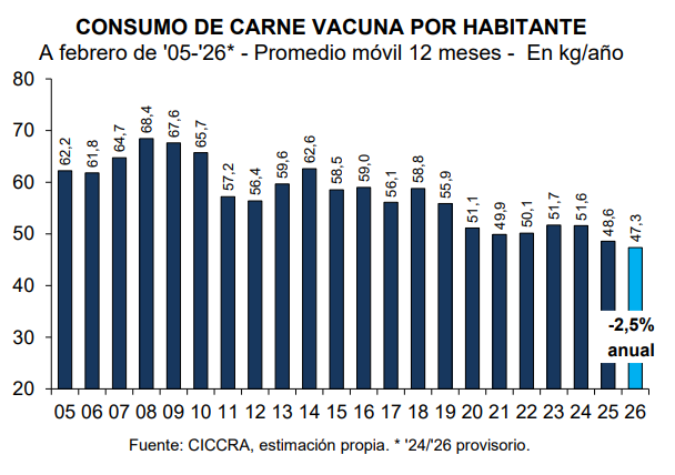 De esta forma, el promedio de los últimos 12 meses del consumo per cápita (en febrero) fue equivalente a 47,3 kilos/año, una caída del 2,5% a febrero de 2025 (-1,2 kg/hab/año).