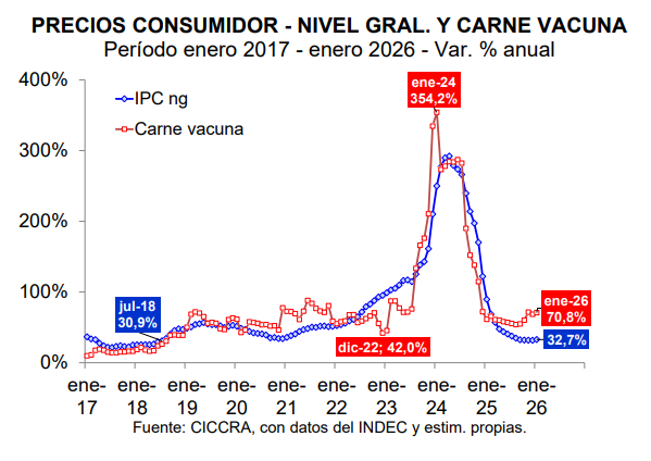 El informe toma los últimos datos del Indec sobre el IPC ( que marca un alza de 4,4% en la carne en enero 2026) y que de esta manera «se observó una desaceleración en el ritmo de aumento del precio promedio de los cortes vacunos, el cual fue de 3,6% mensual».