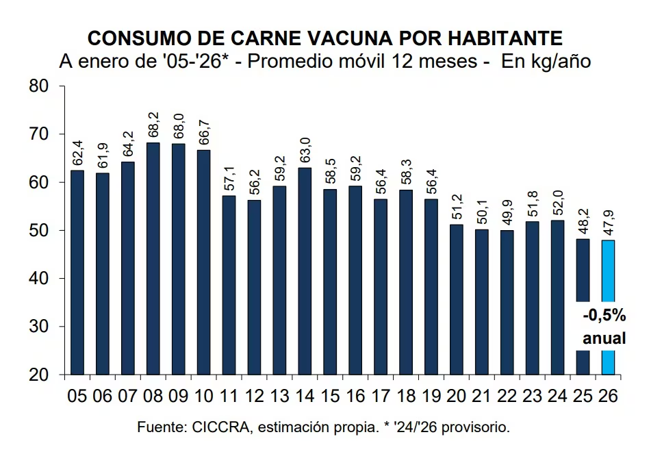 Desde Ciccra informaron que el consumo per cápica promedio de los últimos 12 meses se ubicó en 47,9 kilos por año, lo que implica una reducción del 0,5% comparado con enero 2025 (-0,3 kg/hab/año).