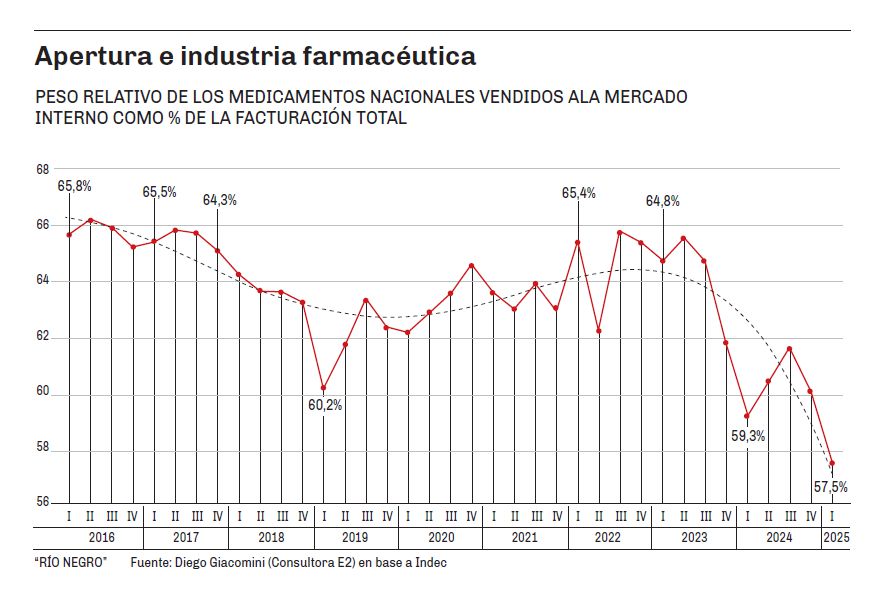 La consultora de Diego Giacomini estimó en base a datos de Indec la dinámica de la participación que tienen los medicamentos de fabricación nacional en las ventas totales internas entre el primer trimestre de 2016 y el primer trimestre de 2025. La industria farmacéutica nacional logra una inserción promedio del 65% a lo largo de la última década.