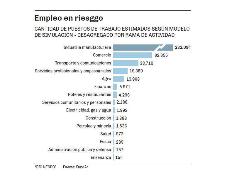 En efecto, el mismo estudio señala que el sector más golpeado en cuanto al empleo por la apertura comercial, sería la industria, donde se perderían unos 282.094 puestos de trabajo. El comercio interno en tanto, resignaría 62.355 puestos, y el transporte otros 33.710.