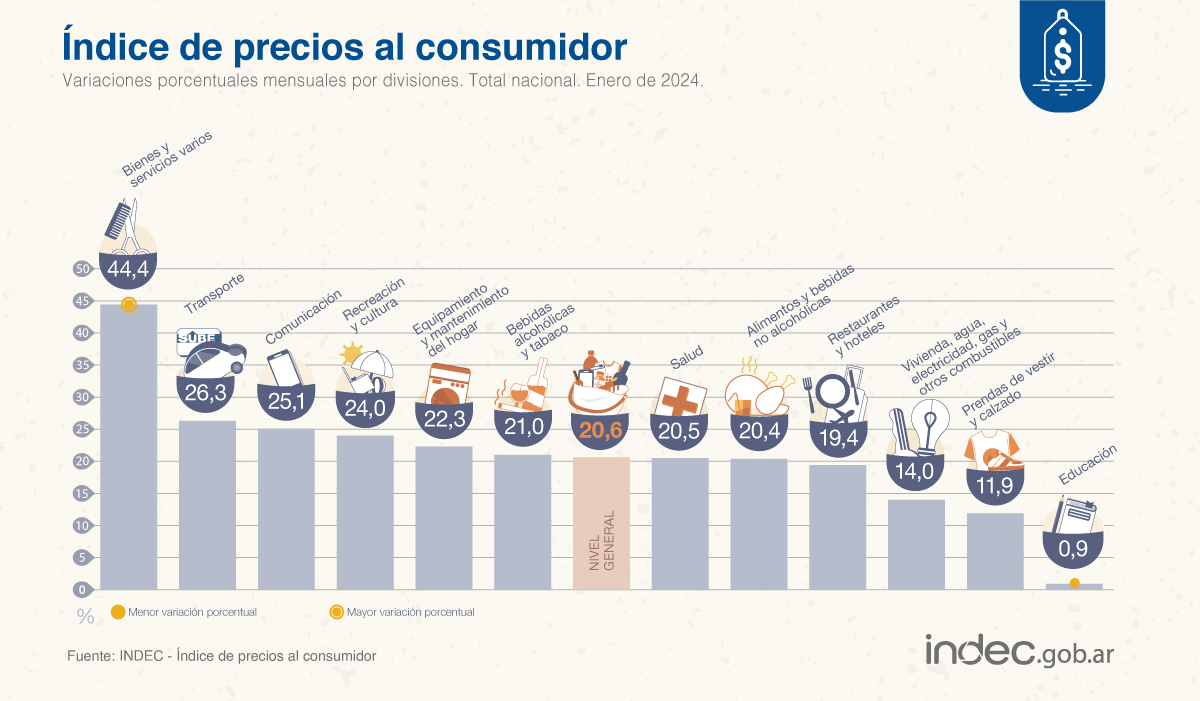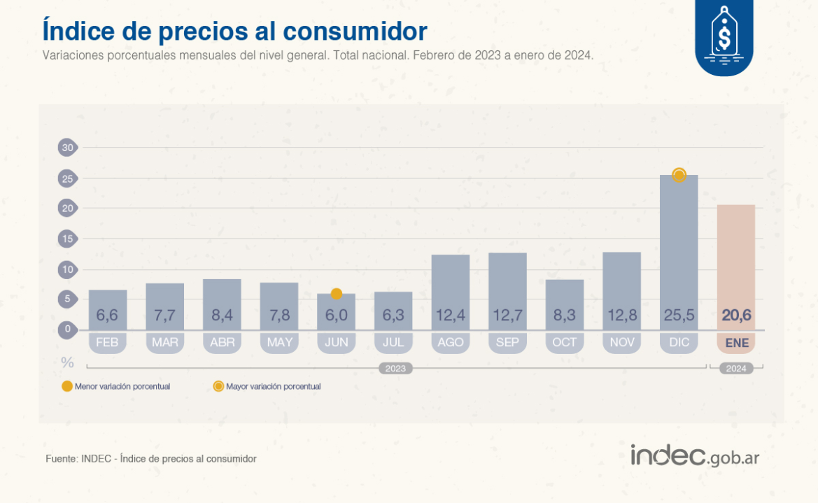 Este miércoles el Instituto Nacional de Estadísticas y Censos (Indec) dio a conocer la inflación de enero, que se ubicó en el 20,6%. El número coincide con las proyecciones privadas, que la ubicaban en torno al 20%.