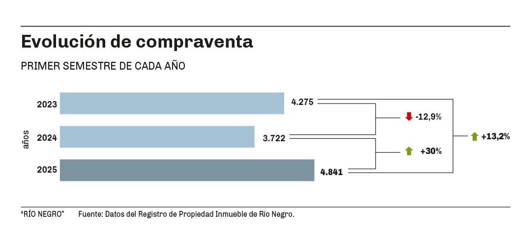 Las estadísticas del Registro de Propiedad Inmueble indican que en el lapso enero-junio del 2024 se anotaron 3.722 “compraventas”, mientras que en ese semestre del 2025 se sumaron 4.841, es decir, 1.119 cesiones de dominio más. Eso equivale al 30%.