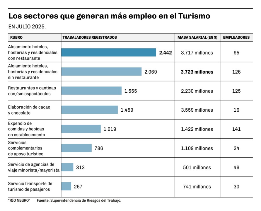 El informe oficial señala que en julio de 2025 la hotelería, hosterías y residenciales tenían 4.500 empleados registrados (que dependen de 221 empleadores), con una masa salarial ese mes de unos 7.500 millones de pesos. A este grupo se deben sumar propietarios y familiares ya que muchos de estos establecimientos están administrados por sus propios dueños y nucleo familiar.