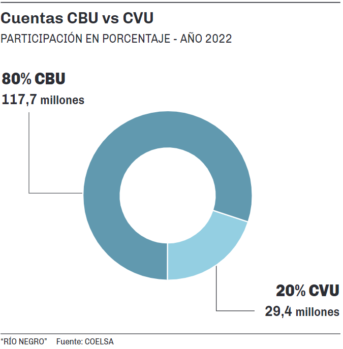 El número de billeteras virtuales (o Cuentas CVU ) aumentó entre semestres un 19%, mientras que la cantidad de cuentas bancarias (o Cuentas CBU) lo hizo en un 9%. Las cuentas CBU representan un 80% del total de cuentas de Argentina, mientras que la participación de las billeteras virtuales es del 20%. Por cada titular, hay en promedio 3 cuentas provistas por bancos y 1,5 provistas por fintech.