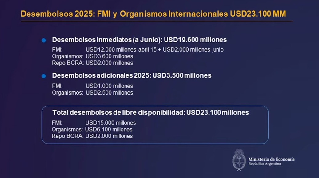 En cuanto a los desembolsos adicionales en 2025, el titular de la cartera económica informó que llegarán otros US$1.000 millones del FMI y US$2.500 millones de otros organismos multilaterales de crédito.