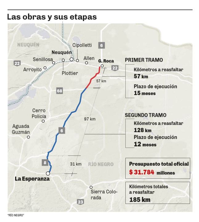 La empresa CN SAPAG S.A tendrá a su cargo la repavimentación de la Ruta Provincial N° 6 en el tramo Empalme Ruta Nacional 22 y Empalme Ruta Provincial 68. En tanto, la empresa Centro Construcciones S.A. es la adjudicataria de los trabajos de repavimentación del restante tramo de la RP 6 y el correspondiente a la RP 8 hasta el paraje La Esperanza.