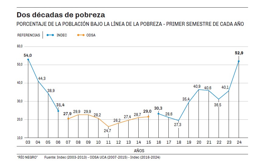 No obstante los datos que en aquel entonces no ofrecía el Indec, pueden obtenerse de otras fuentes de medición como el Observatorio de la Deuda Social (ODSA) de la UCA. Si los números de las últimas dos décadas se miran en perspectiva, la primera sensación es un ‘deja vú’: esta película ya la vimos.