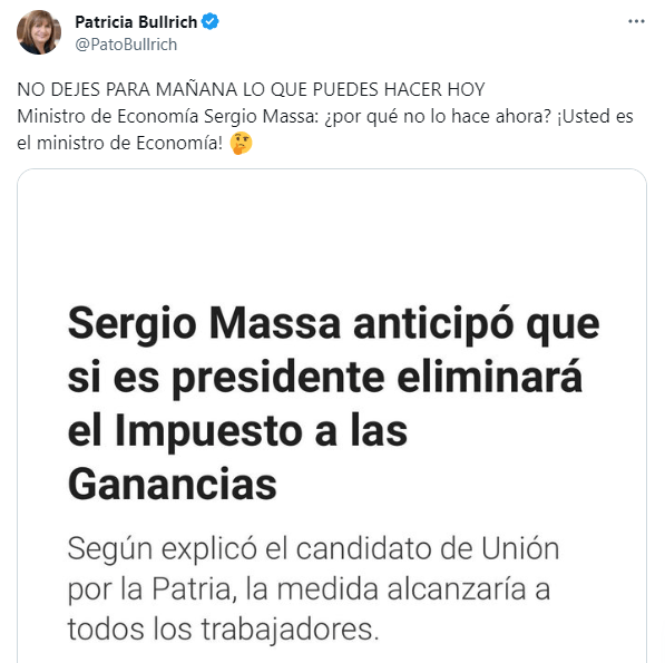 Los casos más emblemáticos fueron los de Patricia Bullrich y Mauricio Macri. La semana pasada cuando Sergio Massa anticipó en una entrevista su intención de eliminar el Impuesto a las Ganancias, la candidata de Juntos por el Cambio había desafiado en twitter: «NO DEJES PARA MAÑANA LO QUE PUEDES HACER HOY Ministro de Economía Sergio Massa: ¿por qué no lo hace ahora? ¡Usted es el ministro de Economía!». La respuesta del ministro fue contundente.